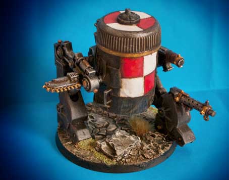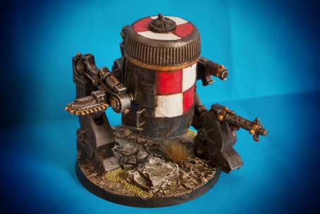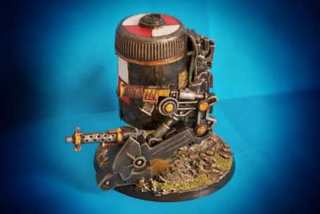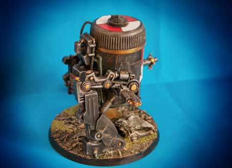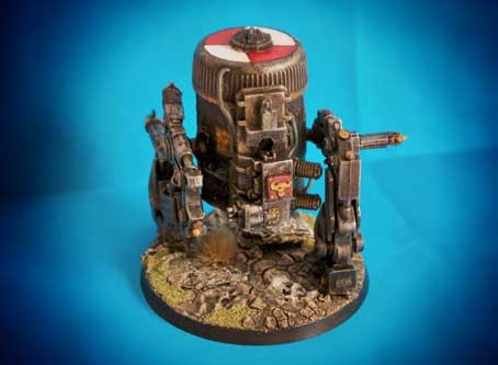 Una volta asciugato completamente il primer nero ho utilizzato la tecnica del dry brush o pennello a secco, la tecnica consiste nel ripulire il pennello da quasi tutto il colore (questo con della carta da cucina tipo scottex ) e quindi stenderlo sulle parti in rilievo della miniatura. Il pennello usato è un pennello n° 2 in pelo di bue, in precedenza avevo tagliato la punta lasciando solo la parte centrale del pennello (volendo si possono utilizzare anche pennelli a lingua di gatto). Ho steso quindi i colori con questa tecnica: un grigio scuro (parte centrale gambe e torretta della Killa ), metallo brunito e oro sulle armi e apparato motore); terminata questa fase ho dato dell’inchiostro nero e seppia su tutta la miniatura, lumeggiando in seguito le parti metalliche con dell’oro e dell’argento. Sulla parte centrale e le gambe ho riutilizzato la tecnica del dry brush stendendo una mano di color sabbia (mano molto leggera), questo per simulare l’usura del colore e la polvere. Sono passato quindi a disegnare una scacchiera bianca e rossa sia sul ventre del mezzo orchesco sia sulla torretta, terminata la pittura ho delineato la scacchiera con del colore ad olio molto diluito color terra d’ombra (questo per simulare la ruggine). I cavi li ho dipinti color verde militare, lavandoli poi con il terra d’ombra usato per delineare gli scacchi. Per il terreno ho utilizzato sempre il pennello a secco dando varie mani di carnicino sempre più chiaro, terminando poi con una spolverata di bianco; ho dettagliato il tutto con dei cespugli e dell’erba sintetica.