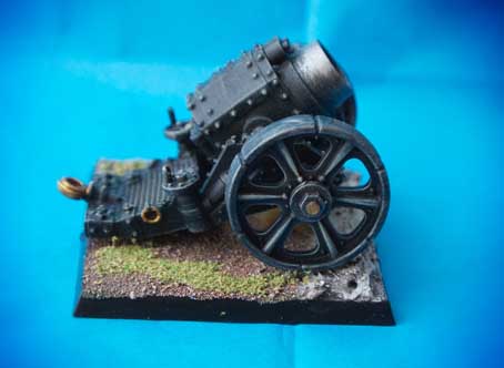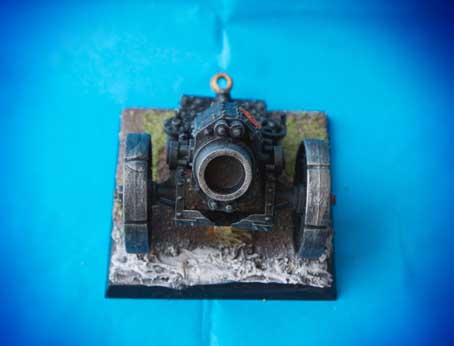 Questa Zkaglia degli Space Orks proviene da un kit in resina creato dalla Games Workshop per il gioco Warhammer 40,000, il pezzo è parte integrante dell’esercito degli Orks. Per prima cosa ho lavato le componenti della scatola con del sapone per piatti, questo per sgrassarle e rendere la pittura più agevole, poi con un cutter e una mini cesoia ho separato le parti dall’albero di fusione ripulendole da eventuali sbavature, ho quindi assemblato le varie parti con della colla cianoacrilica (Super Attak); la Zkaglia è stata pozionata su di una base quadrata di plastica 40×40 previamente testurizzata con del colore Lustrian Undergrowth della Citadel. Una volta asciugato il tutto ho dato una base di primer spray nero su tutto il pezzo; utilizzando quindi la tecnica del Dry Brush ho dato una mano di grigio sulle parti in rilievo della bombarda, con la stessa tecnica ho dato un color metallo brunito sulla camera di scoppio e sulle ruote. In seguito ho lumeggiato le parti metalliche con del colore più chiaro (argento e oro) dettagliando con del colore più scuro le parti eventualmente sottoposte ad usura. Il terreno è stato dipinto con la tecnica del Dry Brush passando in varie fasi tonalità sempre più chiare di carnicino e aggiungendo poi dell’erba sintetica.