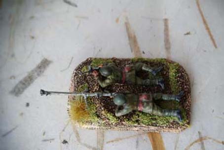 Terminata la pittura prepareremo il terreno incollando con colla vinilica su di una basetta tonda in plastica della sabbia mista a ghiaietta da modellismo a cui aggiungeremo dei pezzi di sughero per simulare le rocce, asciugato il terriccio dipingeremo con un verde oliva il tutto. Quindi con la tecnica del dry brush daremo varie mani di carnicino e di sabbia in tonalità sempre più chiare, terminato il lavoro di pittura incolleremo le miniature sul terreno con della colla cianoacrilica, in seguito dettaglieremo il tutto con erba e cespugli sintetici.