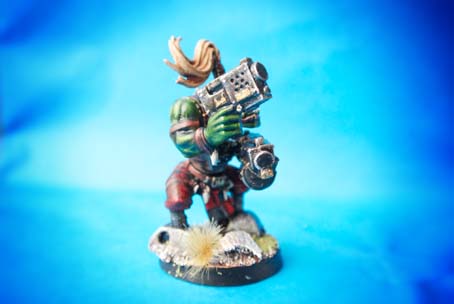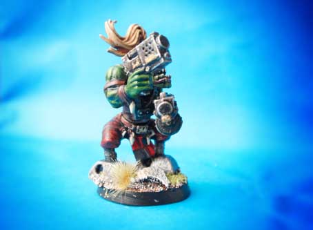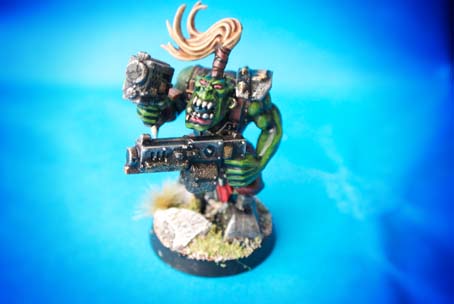 Questa miniatura della Citadel in plastica scala 28mm rappresenta un orchetto spaziale da utilizzare per il gioco Warhammer 40,000, il soldatino fa parte della scatola denominata Ork Boyz, nella confezione si ha la possibilità di assemblare dieci orki spaziali con differenti possibilità di montaggio. Avendo in precedenza utilizzato i piedi di uno dei pezzi per un’altra rielaborazione mi trovavo un pezzo mutilato, ho quindi preso due meccanismi facenti parte di un mezzo di un altro gioco di fantascienza e con pochi colti di cutter e aggiustamenti con carta abrasiva ho sostituito i piedi con delle protesi meccaniche..