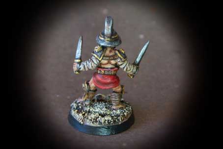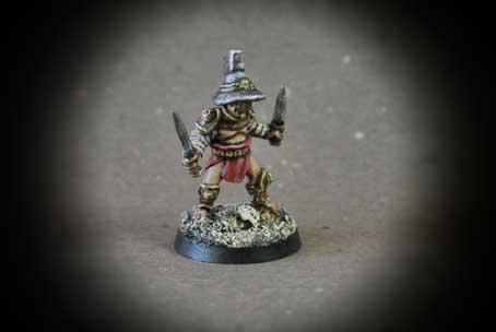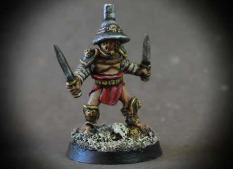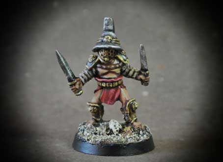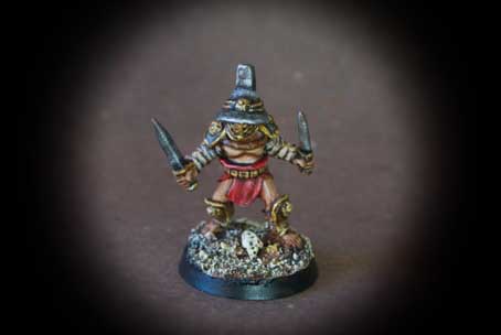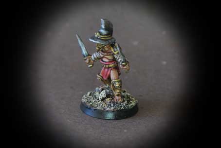 La miniatura che propongo oggi è un bellissimo pezzo della Crusader Miniatures, la Crusader ha in catalogo una serie molto interessante dedicata agli antichi gladiatori, sono pezzi in metallo della scala in 28mm.Come sempre ho prima ripulito il pezzo con della carta abrasiva e un cutter ben affilato, quindi ho incollato il nostro gladiatore su di una basetta tonda del diametro di 20mm, sulla medesima basetta ho incollato con della colla vinilica della sabbia da modellismo; asciugata la base ho passato una mano di primer spray nero. Successivamente ho steso i colori di base : rosso (perizoma), carnicino scuro (parti del corpo scoperte), cuoio (cintura,protezioni gambali ecc.) metallo brunito e oro scuro (armatura,elmo,gambali),sabbia (terreno); a questo punto ho dato due differenti lavaggi in successione, prima un lavaggio color seppia e in seguito un lavaggio con inchiostro nero.