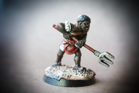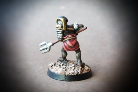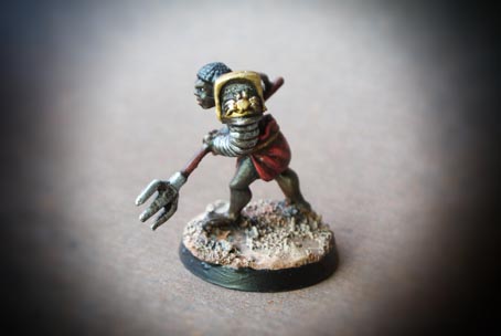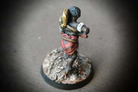 La miniatura che analizzeremo oggi è prodotta dalla Crusader Miniatures, la Crusader ha in catalogo una serie molto interessante dedicata agli antichi gladiatori, sono pezzi in metallo della scala in 28mm.Come sempre ho prima ripulito il pezzo con della carta abrasiva e un cutter ben affilato, quindi ho incollato il nostro reziario su di una basetta tonda del diametro di 20mm, sulla medesima basetta ho incollato con della colla vinilica della sabbia da modellismo; asciugata la base ho passato una mano di primer spray nero. Successivamente ho steso i colori di base : rosso (perizoma),panna (frange perizoma), marrone nocciola (parti del corpo scoperte), cuoio (cintura,cinghie) metallo brunito e oro scuro (tridente,protezioni braccio) ,sabbia (terreno),marrone scuro (asta tridente) nero (capelli); a questo punto ho dato due differenti lavaggi in successione, prima un lavaggio color seppia e in seguito un lavaggio con inchiostro nero.