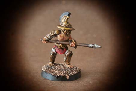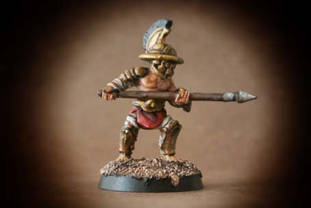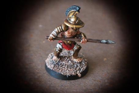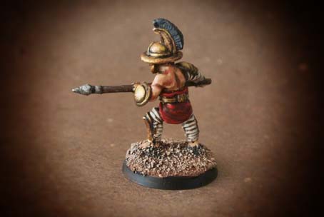 Il pezzo che analizzo oggi è un bellissimo soldatino della Crusader Miniatures, la Crusader ha in catalogo una serie molto interessante dedicata agli antichi gladiatori, sono pezzi in metallo della scala in 28mm.Come sempre ho prima ripulito il pezzo con della carta abrasiva e un cutter ben affilato, quindi ho incollato il nostro gladiatore su di una basetta tonda del diametro di 20mm, sulla medesima basetta ho incollato con della colla vinilica della sabbia da modellismo; asciugata la base ho passato una mano di primer spray nero. Successivamente ho steso i colori di base : rosso (perizoma), carnicino scuro (parti del corpo scoperte), cuoio (cintura,protezioni gambali ecc.) metallo brunito e oro scuro (armatura,elmo,gambali),sabbia (terreno); a questo punto ho dato due differenti lavaggi in successione, prima un lavaggio color seppia e in seguito un lavaggio con inchiostro nero.