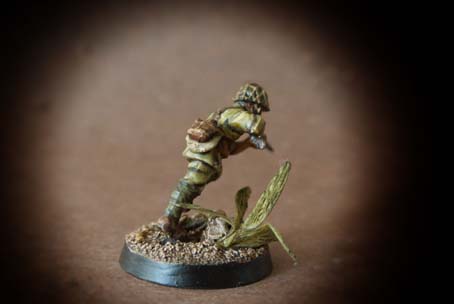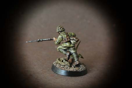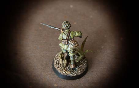 Dopo aver scelto tra le varie opzioni sia di corpi che di armamento ho assemblato la miniatura utilizzando della colla cianoacrilica posizionandola poi su una basetta tonda del diametro di 20mm; sulla basetta ho incollato con della colla vinilica della sabbia da modellismo. Una volta asciugato il tutto ho spruzzato una prima base di primer acrilico nero, in una secnda fase ho dato sempre con la bomboletta un marrone nocciola. Sono quindi passato a dare la colorazione base : uniforme (death world forest della Citadel) elmetto e fasce (Dunkelgrun della Revell) arma (marrone scuro), buffetterie ,cintura, scarpe (terra di siena bruciato), pelle (carnicino mischiato a giallo brillante), carnicino scuro (terreno), metallo brunito (parti metalliche fucile e baionetta).Su tutta la miniatura ho quindi steso degli inchiostri (Athonian camoshade della Citadel su tutto il pezzo tranne la pelle per la quale ho invece utilizzato il Reikland Fleshshade). Nella fase successiva ho iniziato a schiarire i toni dell’uniforme utilizzando il Japan Uniform wwII della Vallejo mischiato al colore precedentemente utilizzato della Citadel, alla mistura base ho anche aggiunto un ritardante per colori acrilici questo per riuscire ad amalgamare le varie sfumature. Per il resto dell’equipaggiamento ho lumeggiato i colori base con delle tonalità più chiare e delle punte di bianco. Le ombreggiature le ho ottenute aggiungendo alle basi del grigio di Payne e del marrone scuro, per i metalli ho lumeggiato aggiungendo dell’argento brillante. Il terreno è stato dipinto sovrapponendo con la tecnica del dry brush varie tonalità di color sabbia. Alla fine per dettagliare ho incollato delle piante e delle radici autocostruite con del nastro di carta zigrinato ritagliato e poi dipinto in modo da simulare della vegetazione tropicale.