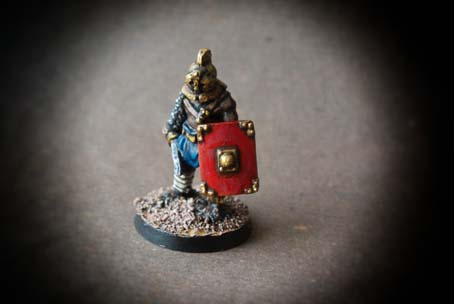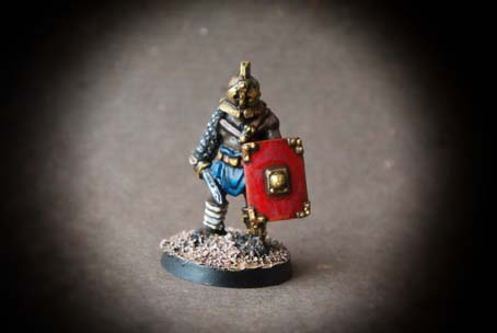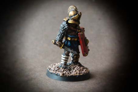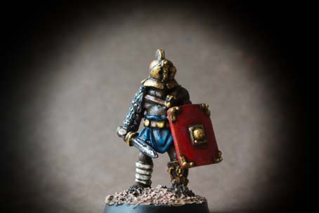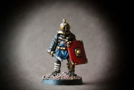 Il gladiatore che propongo oggi è uno splendido pezzo della Crusader Miniatures, la Crusader ha in catalogo una serie molto interessante dedicata agli antichi gladiatori, sono pezzi in metallo della scala in 28mm. Come prassi consolidata ho prima ripulito il pezzo con della carta abrasiva e un cutter ben affilato, quindi ho incollato il nostro gladiatore su di una basetta tonda del diametro di 20mm, sulla medesima basetta ho incollato con della colla vinilica della sabbia da modellismo; asciugata la base ho passato una mano di primer spray nero. Successivamente ho steso i colori di base : blu (perizoma), marrone scuro (parti del corpo scoperte), cuoio (cintura,protezioni gambali ecc.) metallo brunito e oro scuro (armatura,elmo,gambali),sabbia (terreno); a questo punto ho dato due differenti lavaggi in successione, prima un lavaggio color seppia e in seguito un lavaggio con inchiostro nero.