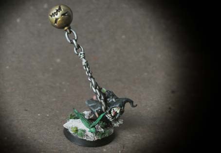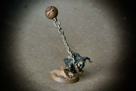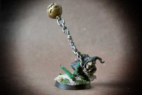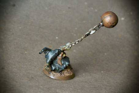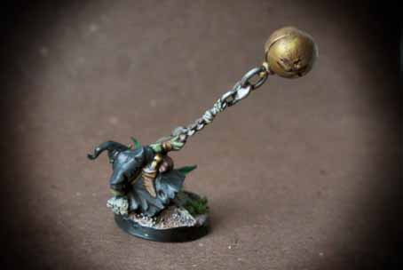 La seconda parte del nostro tutorial comincia con il nostro goblin preparato per la pittura col fondo marrone, a questo punto daremo i colori di base : nero (tunica e cappuccio), bronzo oro (palla), cuoio (fodero pugnale e cintura), verde salvia (viso e pelle) , rosso (lingua), verde oliva (terreno), metallo (catena palla). Su tutti questi colori ho dato diversi lavaggi d’inchiostro, prima un color seppia, asciugato il seppia ho steso un inchiostro verde (pelle e viso),per ultimo il nero su tutta la miniatura.