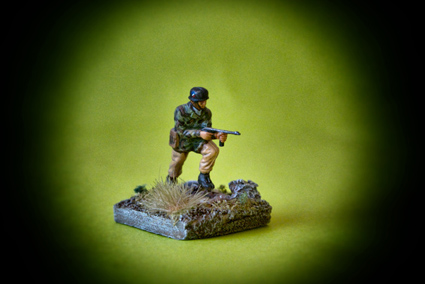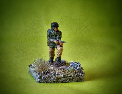 Nel nostro caso il soldatino è già stato dipinto in precedenza; incolleremo la miniatura sulla basetta di cartone con della colla vinilica a questo punto con la medesima colla vi incolleremo della sabbia da modellismo ferroviario
