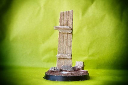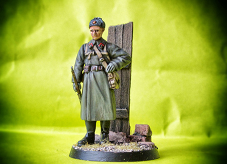 Adesso è il momento di creare l’ambientazione sulla quale posizionare il fante sovietico; costruiremo una staccionata utilizzando della balsa (vedi articolo su come costruire staccionate), incolliamo la staccionata su una base in plastica tonda delle dimensioni adeguate alla scala del soldatino (in alternativa possiamo usare una basetta tonda in legno più o meno pregiato), intorno alla staccionata incolleremo dei mattoncini,delle pietre e delle finte piastrelle mischiate a sabbia ; questo per creare un effetto macerie.
