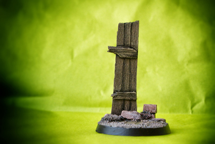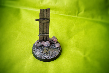 La seconda fase prevede la pittura con il primer bianco su tutta la basetta, quindi stenderemo i colori di base : marrone scuro (staccionata), color mattone e grigio scuro (macerie), verde salvia (terreno); su questi colori daremo una serie di lavaggi con inchiostri (prima verdescuro,poi seppia e alla fine nero). Asciugati gli inchiostri con la tecnica del dry brush daremo varie mani di tonalità differenti di carnicino e sabbia. Alla fine dettaglieremo la palizzata disegnando con inchiostro nero le venature del legno.