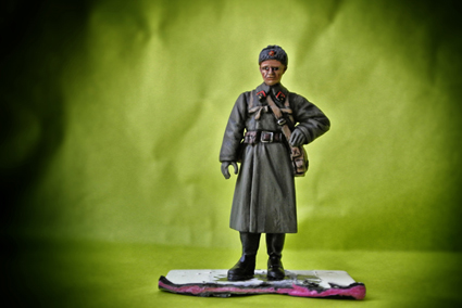 Adesso potremo stendere i colori di base : nero (colbacco,guanti e stivali), cuoio (cintura),Kaki (tascapane e zaino),carnicino (viso), grigio verde (cappotto);una volta dipinta la miniatura applicheremo un lavaggio di inchiostro seppia sull’intero pezzo.