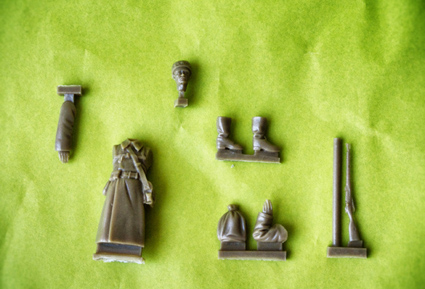 Asciugato il pezzo dovremo separare gli scarti della fusione dalle componenti della miniatura, quest’operazione è molto delicata e potremmo rischiare il danneggiamento, a volte irreparabile del soldatino; utilizzeremo con molta cautela un tronchese da modellismo, renderemo omogenee poi le parti tagliate con della carta abrasiva molto fine; la fase successiva ci vedrà incollare le varie componenti con colla cianoacrilica. In caso di problemi di perfetto adattamento delle parti stuccheremo le eventuali imperfezioni con dello stucco per modellismo (esistono stucchi specifici per plastica e stucchi in pasta a due componenti), dopo la stuccatura daremo un’ulteriore passata di carta abrasiva.