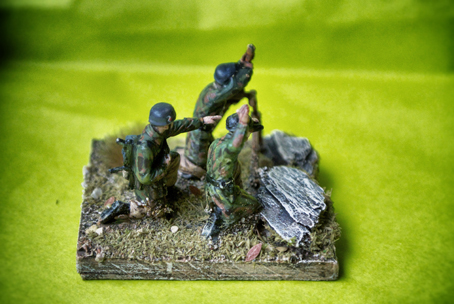 Una volta asciugati dal precedente lavaggio sui pezzi è stato spruzzato un primer trasparente per plastica e poi in seguito del primer bianco ; si è passati quindi alla stesura dei colori di base : grigio scuro (elmetto),verde salvia (giubba mimetica), nero (stivaletti da lancio ,cintura e arma),sabbia (pantaloni),marroncino (terreno e buffetterie ),carnicino (viso e mani).La seconda fase della pittura ha visto dare alle miniature un lavaggio di inchiostro color seppia, asciugato l’inchiostro si è passati alla fase delle lumeggiature; per lumeggiare sono stati usati i colori base con aggiunta di un sabbia chiaro e del bianco, per il carnicino si è utilizzata la base insieme a del giallo brillante e del bianco. Le ombreggiature sono state date aggiungendo ai colori base del grigio di payne, tranne che per il viso e le mani che hanno visto utilizzare del terra di siena bruciato.Un discorso a parte merita la mimetica del Fallschirmjäger al verde salvia di base sono state aggiunte delle chiazze di un verde più scuro e di un bruno marrone . Il terreno è stato dipinto con la tecnica del dry brush sovrapponendo varie mani di gradazioni differenti della tonalità sabbia, terminata la pittura è stata aggiunta dell’erba sintetica e del fogliame secco.