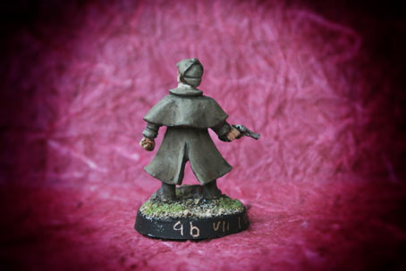 Dopo aver ripulito il soldatino dalle imperfezioni lasciate dalla fusione ho incollato la miniatura su di una base tonda del diametro di 20mm, sulla quale ho aggiunto della sabbia e un mattoncino da modellismo; asciugata la colla ho spruzzato il tutto con del primer spray nero. Quindi ho steso i colori base , nocciola (mantella e berretto)contrariamente all’iconografia classica ho preferito dipingere la mantella con un colore unico e non scozzese, a mio avviso vista la dimensione del soldatino la colorazione scozzese avrebbe causato una cacofonia di colori ; grigio scuro (panciotto e calzoni), marrone scuro (scarpe ), metallo scuro (pistola),carnicino scuro (viso e mani),panna (colletto camicia), verde oliva (terreno),terra di siena (mattone); sul tutto poi ho dato un lavaggio d’inchiostro nero. Asciugato l’inchiostro sopno passato alla fase della lumeggiatura, i colori sono stati tutti schiariti con delle punte di bianco; tranne che per il carnicino dove ho usato un misto di colore base,sabbia e giallo brillante; i metalli sono stati schiariti con delle tonalità più chiare (oro brillante e argento). Nella fase dell’ombreggiatura ho mischiato ai colori di base del grigio di Payne; per il carnicino ho invece utilizzato un Terra di Siena bruciato.