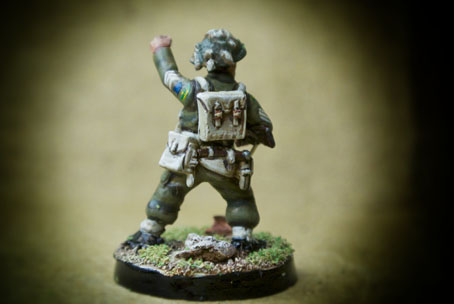 Come colore di base ho scelto quindi un Brown Violet della Vallejo (serie model color), con questo ho fatto l’uniforme, per le buffetterie e le ghette un kaki (sempre Vallejo), Elmetto un Russian Uniform (Vallejo), viso e mani un carnicino scuro,il terreno è stato dipinto con verde oliva; sul tutto ho steso una mano d’inchiostro seppia.