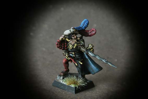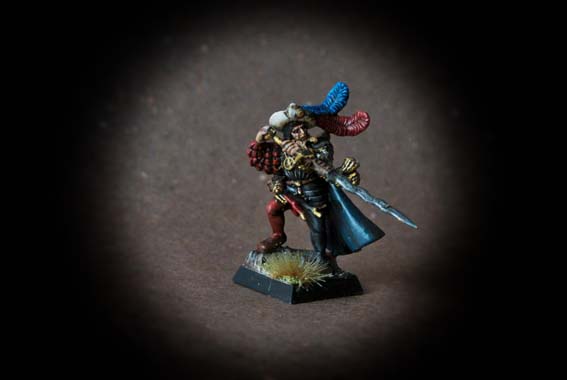 Il Capitano dell’Impero che ho dipinto proviene da un blister della Games Workshop della linea dedicata al gioco Warhammer Fantasy Battle, il pezzo è scolpito perfettamente come nello stile GW, ed è ispirato ai Lanzichenecchi Tedeschi. La miniatura è in plastica scala 28mm; per prima cosa ho sgrassato il soldatino lavandolo con detersivo per piatti, in seguito ho staccato i vari pezzi ripulendoli con un cutter ben affilato e della carta abrasiva. Il tutto è stato poi assemblato utilizzando della colla cianoacrilica (Attak o similari), la basetta era già prestampata con del terreno e vari elementi scenici; asciugata la colla ho spruzzato sul pezzo del primer spray nero.