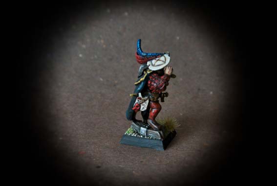 Nella seconda fase ho lumeggiato la miniatura schiarendo i colori utilizzati con altri colori leggermente più chiari e aggiungendovi una punta di bianco; per le ombreggiature ho utilizzato le tinte di base con un piccola aggiunta di grigio Di Payne.Per i metalli ho utilizzato punte d’argento mischiate al colore di base per schiarire i toni (questo sia per il metallo brunito che per l’oro.