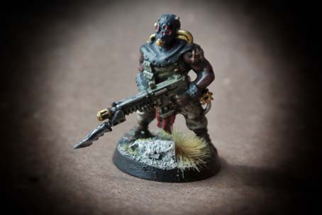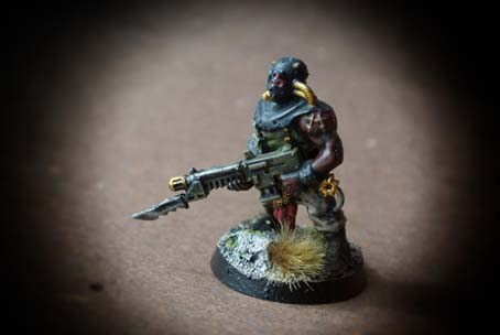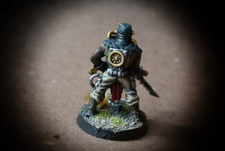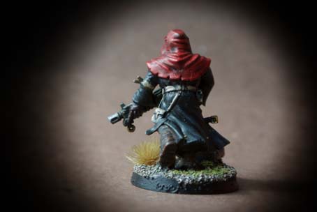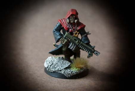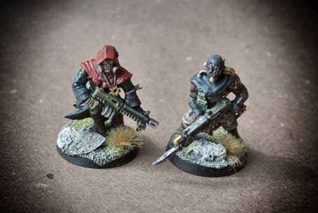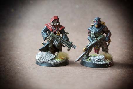 I due Cultisti del Chaos presi in esame fanno parte di una scatola contenente 5 pezzi in plastica in differenti posizioni, le miniature sono in plastica scala 28mm, l’assemblaggio è abbastanza semplice, le miniature sono ben dettagliate. La prima operazione consiste nel lavare tutte le componenti con del detersivo per piatti (questo per sgrassarle da eventuali residui di lavorazione) , il lavaggio successivo deve essere forte e prolungato. La seconda fase consiste nello staccare i pezzi dallo sprue e nell’assemblarli. Utilizzeremo un piccolo tronchese e un cutter molto affilato; per l’assemblaggio useremo una colla per plastica oppure della cianoacrilica. Le miniature sono state montate sulla basetta tonda in plastica del diametro di 20mm; sulla basetta ho aggiunto della sabbia e del sughero (incollati invece con della colla vinilica tipo Vinavil). Asciugata la colla ho steso una mano di primer nero Spray, asciugato il primer ho iniziato a stendere i colori di base : Rosso (cappuccio e perizoma); grigio scuro (cappuccio,impermeabile,stivali, bracciali); sabbia (calzoni); marrone scuro (pelle e stivali); verde oliva (maglia,armi,terreno) metallo brunito e oro (particolari armi e maschera).