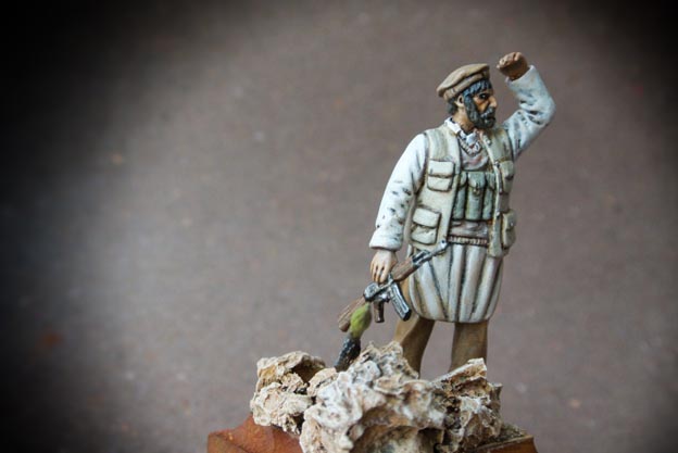 Il soldatino che prenderemo in esame fa parte di un set in resina prodotto da Verlinden in scala 1:35, nella confezione sono presenti due combattenti Talebani del periodo dell’invasione Sovietica; i pezzi sono da assemblare . Una volta scelto il soldatino da dipingere ho sgrassato la resina lavando i vari componenti con sapone per i piatti dopo aver risciacquando abbondantemente li ho prima ripuliti con carta abrasiva molto fine incollandoli poi con colla cianoacrilica, il pezzo così preparato è stato posizionato su di una base provvisoria in cartoncino. Finita questa prima fase ho spruzzato il primer spray bianco sul soldatino, asciugato il primer sono passato alla colorazione base; per documentarmi ho guardato numerose foto scattate durante il primo conflitto Afghano, consultando gli archivi delle principali agenzie fotografiche specializzate in reportage di guerra (in questo sono stato facilitato dalla mia professione di photoeditor). Quindi ho scelto dei colori che rispondessero alla realtà e alla tradizione delle varie etnie che abitano l’Afghanistan, cioè marroni di varie tonalità dal terra al sabbia; per la carnagione ho mischiato al carnicino un marroncino nocciola (come base di partenza); dopo aver dato i colori di base ho effettuato sulla miniatura un lavaggio con un seppia molto diluito. Le lumeggiature le ho effettuate schiarendo le varie tonalità di base con del panna e del bianco; per la pelle ho schiarito il colore base con del sabbia mischiato a giallo brillante e bianco. Le ombreggiature le ho fatte mischiando ai colori di base del nocciola mischiato a terra di siena bruciato e grigio di payne, medesima cosa per la carnagione. Il terreno roccioso lo ho creato incollando dei pezzi di sughero mischiati a della sabbia da modellismo; in seguito ho steso una base bianca su tutto il terreno e poi ho dato un colore marrone mischiato a del verde oliva . La fase successiva ha visto un lavaggio su tutta la basetta effettuato con un inchiostro color seppia. Successivamente utilizzando la tecnica del dry brush ho dato varie mani di tonalità differenti di carnicino, terminando con un panna chiaro. A questo punto ho incollato il soldatino sulla basetta ultimata e ho aggiunto il lanciarazzi e il fucile mitragliatore dipinti in precedenza.